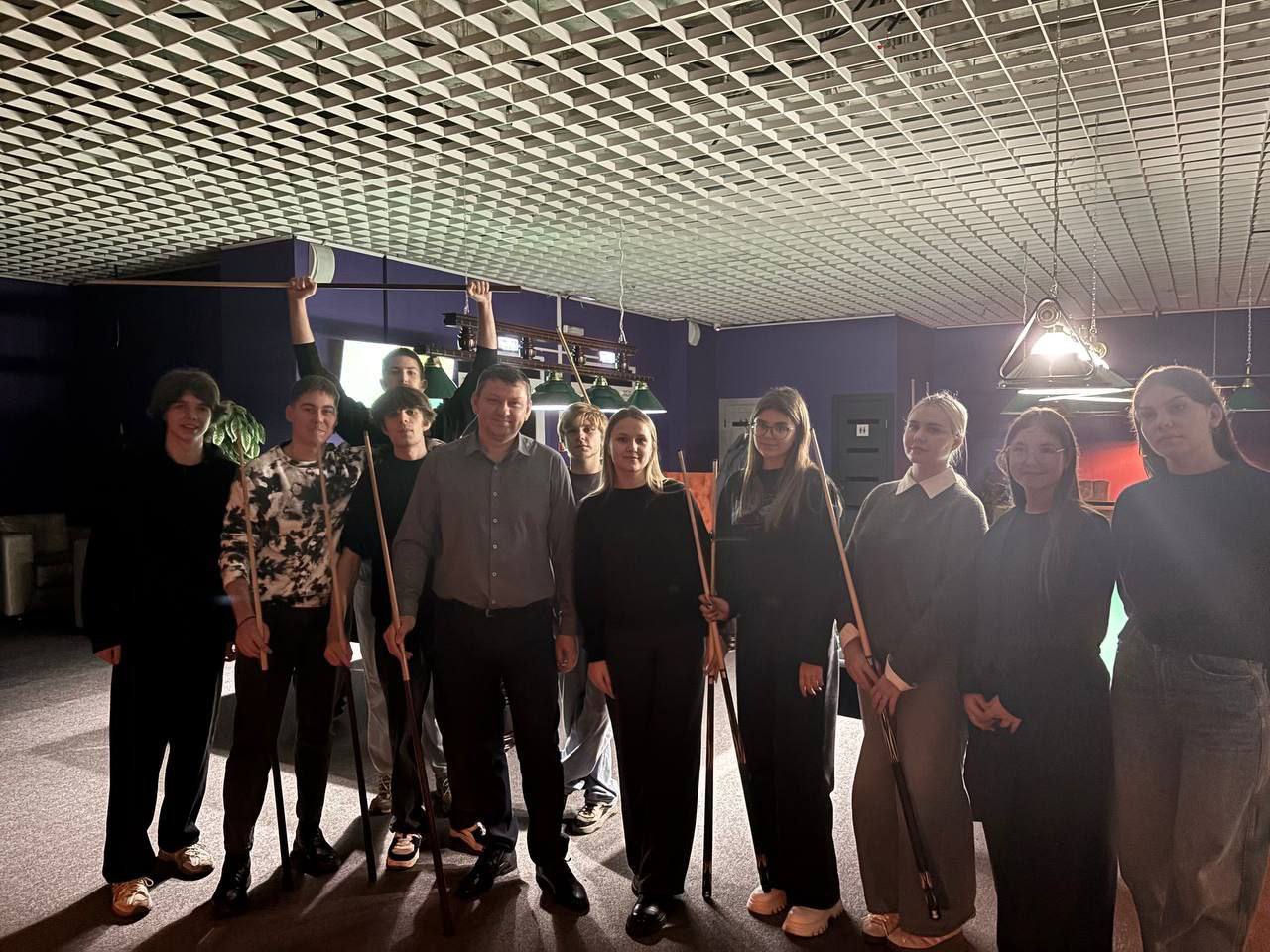Группа 25ЗиК2 во главе с куратором, заведующим кафедрой «Землеустройство и геодезии» Алексеем Ивановичем Чурсиным, устроила бильярдный баттл.